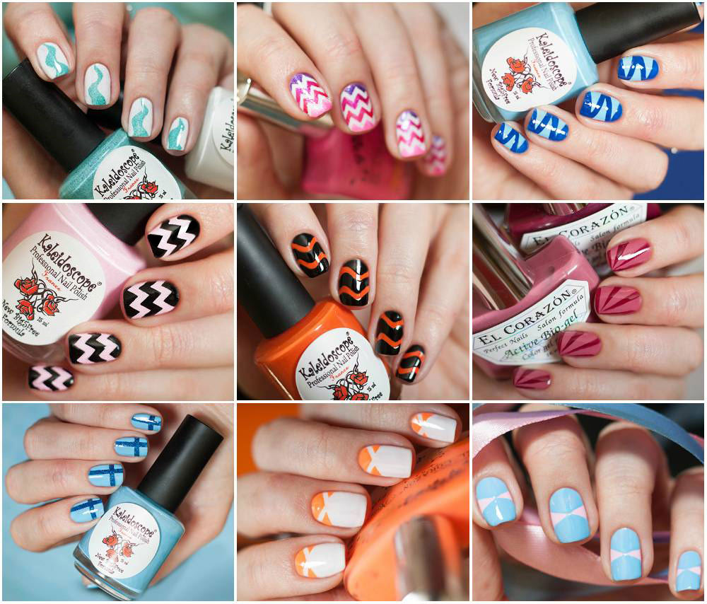 Скотч – это идеальный вариант для создания геометрического маникюра, который так популярен в новом году. Это может быть маникюр с полосками, в котором чередуются разноцветные горизонтальные и вертикальные линии. С помощью такого подручного средства можно нарисовать елочку, зиг-заг, ромбы, треугольники и другие геометрические фигуры.