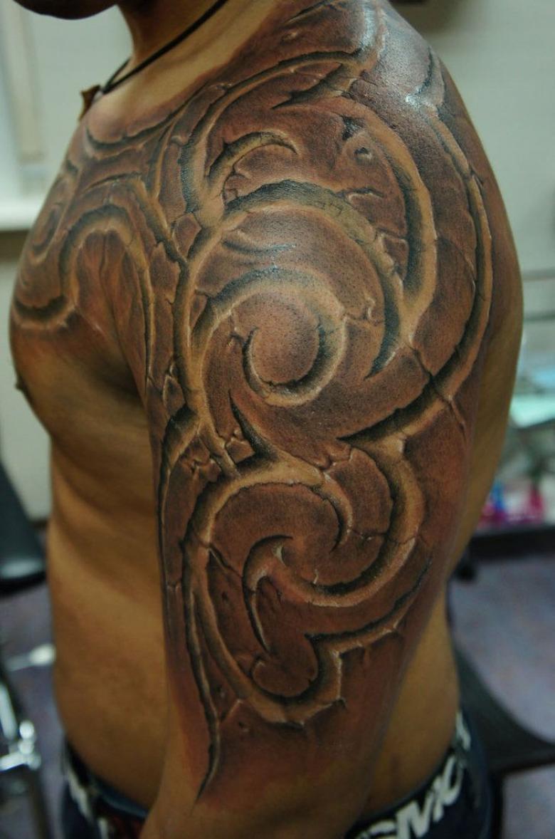 Но нынешний стиль трайбл включает много других элементов, в том числе и необычные 3-D эффекты. Такие рисунки выглядят объемными. Достигается подобный результат за счет использования определенных наклонов и тени. Такие татуировки стали популярны из-за своего эффектного вида.