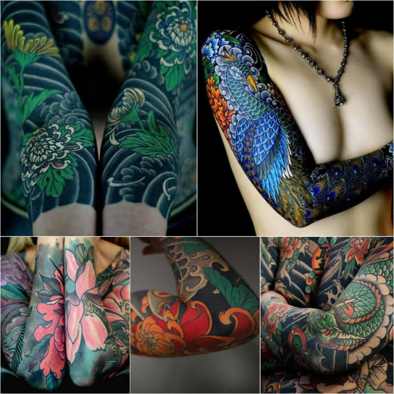 Это яркие и насыщенные работы с изображением в орнаменте мифологических животных или птиц, самураев, гейш, иероглифов, рыб. Часто набивались целые сюжеты.