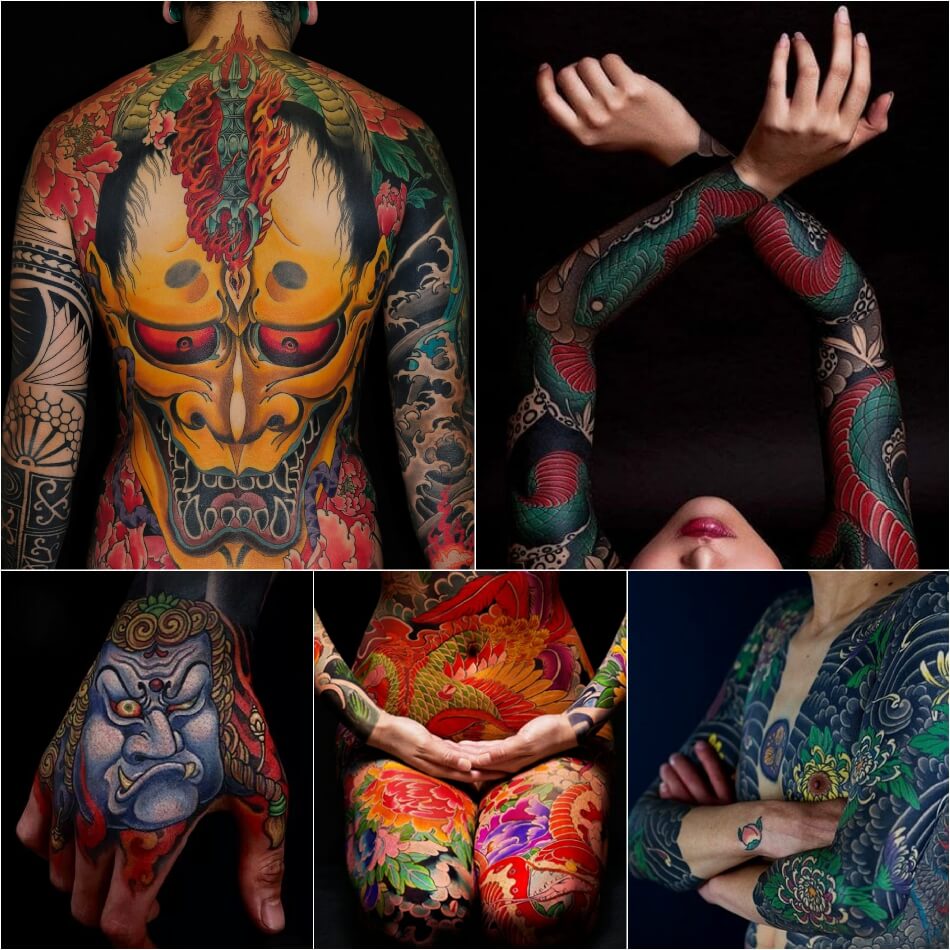 Это яркие и насыщенные работы с изображением в орнаменте мифологических животных или птиц, самураев, гейш, иероглифов, рыб. Часто набивались целые сюжеты.