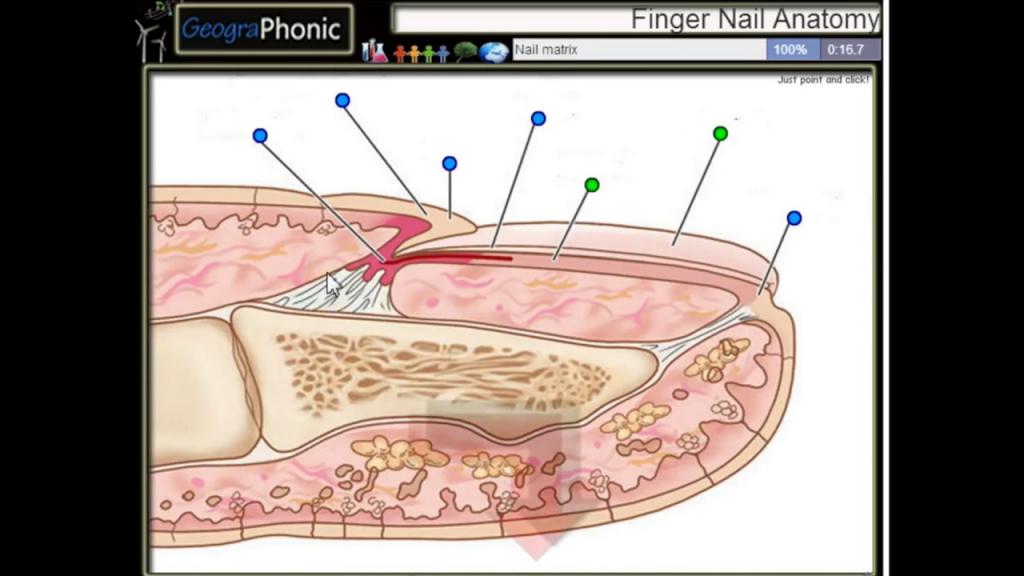 Под ногтем располагается ногтевое плато, или ложе. Оно богато кровеносными капиллярами, поэтому при любой травме кровь остановить нелегко. Здесь продолжается ткань матрикса ногтя, которая имеет гораздо меньший слой, чем под кутикулой. Это определяет разную скорость роста частей ногтя: на поверхности его клетки двигаются к свободному краю в три раза медленнее, чем те, что непосредственно соприкасаются с ложем.