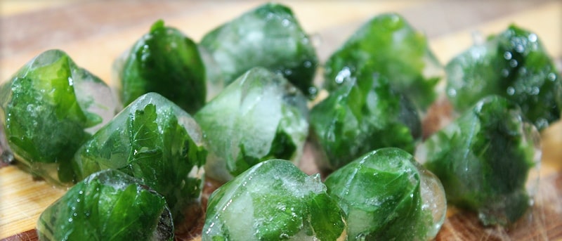 - Зелень порубить или измельчить в кофемолке, вложить в секции для заморозки и сверху налить воды (минеральной или обычной, чистой). Поставить в камеру и каждое утро растирать кубики льда по лицу, причем во всех зонах.