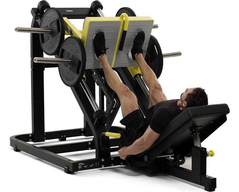 Горизонтальный жим ногами. Основная цель: ягодичные мышцы и квадрицепсы. Тело на данном инвентаре зафиксировано в стабильном положении, а основная нагрузка ложится на берда с ягодицами. При увеличении нагрузки и сгибании ног как для «плие» происходит тренировка внутренней поверхности бедер.
