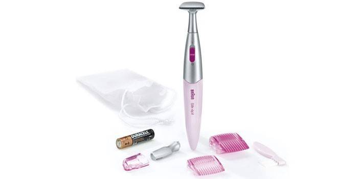 - характеристики: женский триммер Браун для бритья и точечного удаления волос, время автономной работы – 2 часа, можно использовать с пеной, есть насадка-ограничитель, со щеткой для очистки, футляром, защитной крышкой;