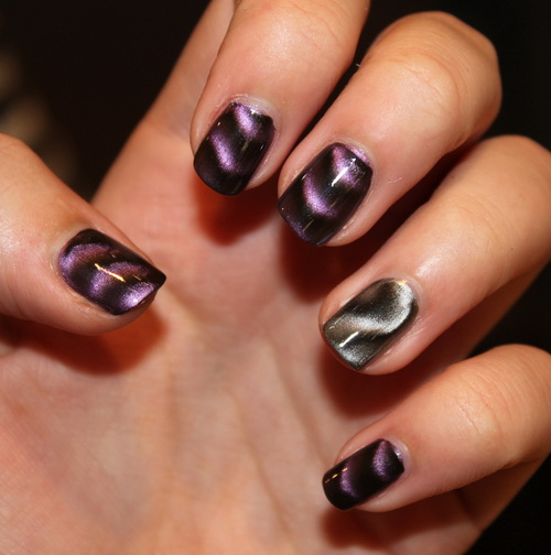 Узоры получаются непосредственно из-за воздействия магнита на частички металла в лаке. После окрашивания нужно сразу же поднести его очень близко, но следите за тем, чтобы он не прикасался к лаку. В зависимости от рисунка, магнит нужно держать от трех до десяти секунд, а чтобы «иллюстрация» получилась одинаковой на всех ногтях, необходимо засекать время воздействия магнита и следить за его положением. Лаки продаются в основном в темных тонах, так как на светлых рисунок практически незаметен. Эти оттенки замечательно выглядят именно на коротких ногтях.