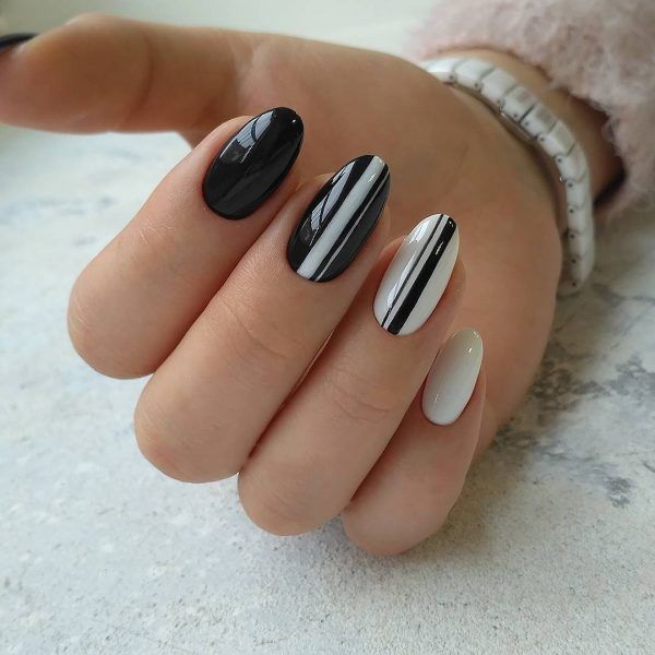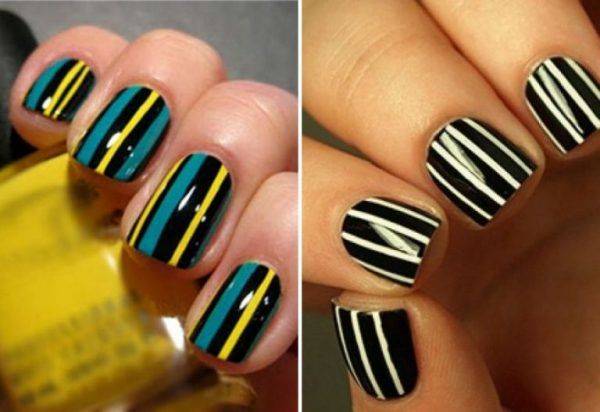 Используйте для создания красивого маникюра полоски. Их можно отрезать от скотча для ровных полос, или использовать покупные. Они выпускаются в различных формах: зигзаг, полукруг, овал. Схемы красивого маникюра с полосками предоставлены ниже.