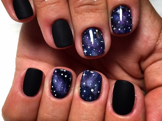 Кроме простого черного актуальны насыщенные чернильные оттенки синего и фиолетового. Из простых узоров, которые ты можешь повторить самостоятельно – мраморные разводы и точки. Структура гель-лака позволяет перекрыть черный даже белыми орнаментами.