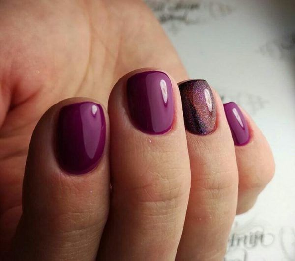 Существует стереотип, что темный цвет годится только для длинных ногтей, потому что выглядит броско и тяжело. Абсолютная неправда, а особенно если разбавить темный декором из фольги или блесток. Очень популярно сочетание нескольких смежных цветов: от более светлого к более темному.