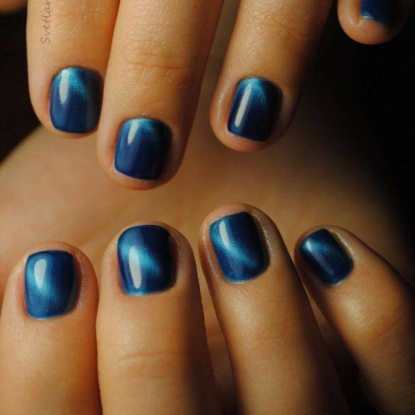 Подкорректировать пластину можно и с помощью темного покрытия с добавлением шиммера. Создавая эффект, подобный «кошачьему глазу».