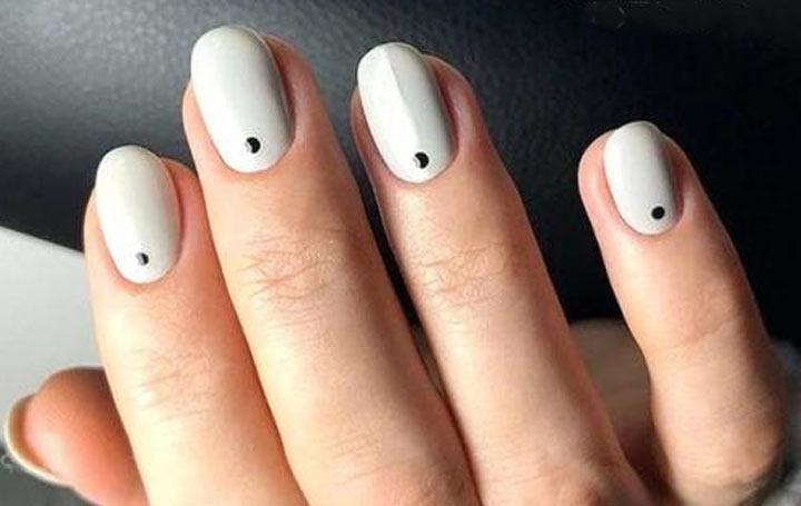 Выигрышно смотрится минималистический рисунок с точкой. Для такого дизайна достаточно поставить 1 точку на ноготь, желательно у основания. Удобнее всего это сделать дотсом, ну или иголкой. Техника работы с дотсем очень проста.