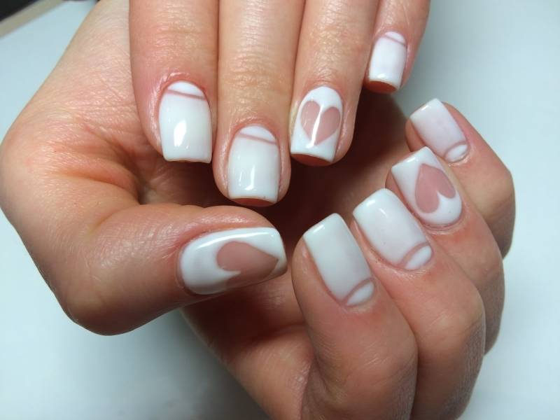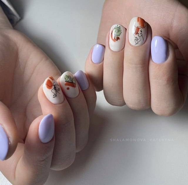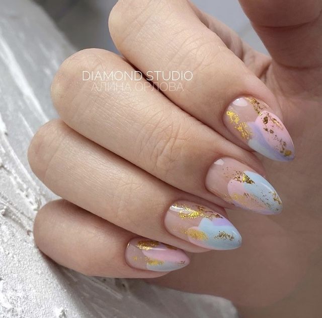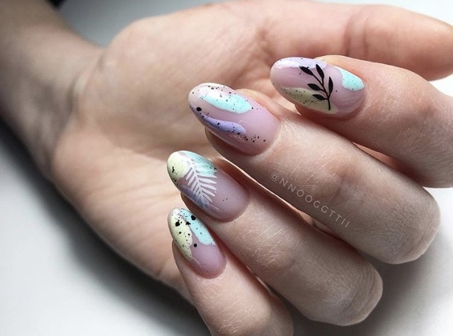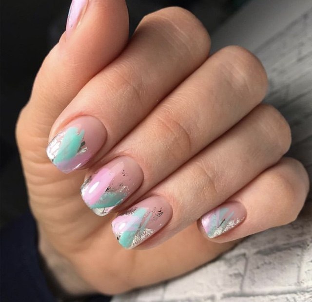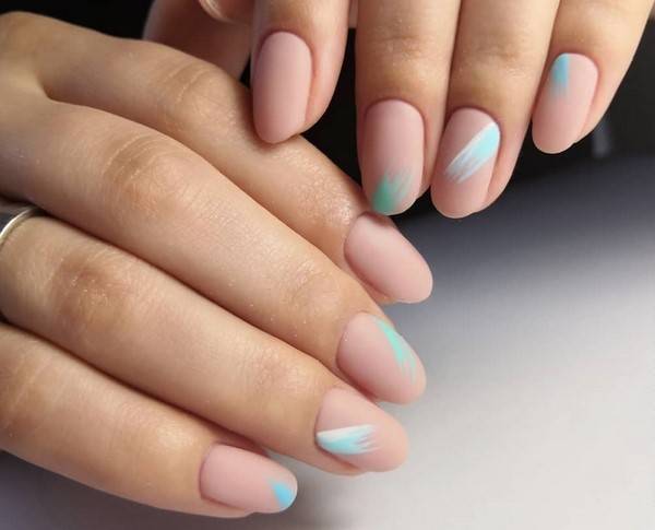 Отличным выбором будет маникюр в молочном оттенке с небольшими лаконичными пастельно-розовыми или светло-небесными мазками. Также прекрасно будут смотреться ногти в натурально-бежевом оттенке с короткими бледно-мятными мазками.