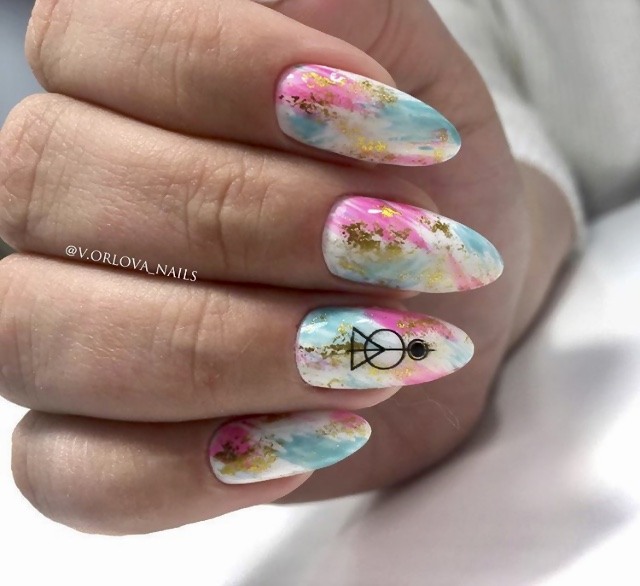 Также красиво и необычно будет смотреться маникюр с мазками, если поверх самих мазков расположить наклейки с надписями или геометрическими фигурами.
