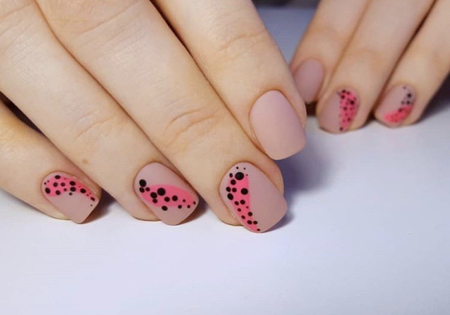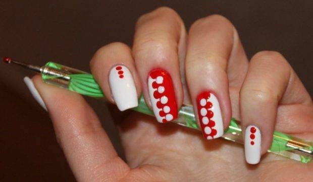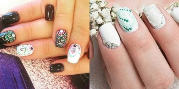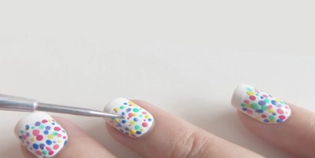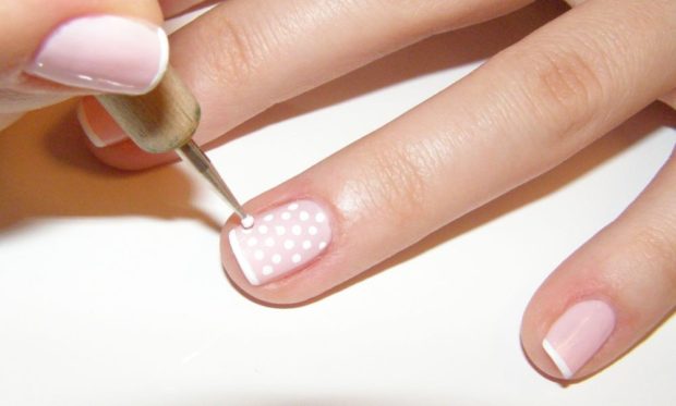 Как и в предыдущих случаях, первым делом делаем маникюр, наносим базовый слой лака и ждем, пока он высохнет. Затем делаем точки с помощью иглы и, плавно передвигаясь от одной к другой, формируем заранее продуманный узор. Когда с рисованием покончено, даем лаку высохнуть, и покрываем ногти топом.