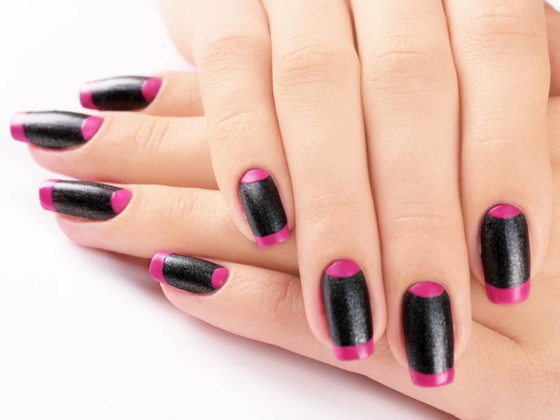 - Накрасьте ногти последовательно полосами любых трех цветов (можно выбрать как контрастные, так и гармонично сочетающиеся между собой) 2. После высыхания наклейте на ногти тонкие полоски скотча 3. Нанесите лак черного цвета на всю поверхность ногтя 4. Дождитесь пока лак высохнет и снимите полоски 5. Нанесите закрепитель