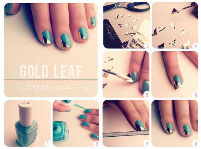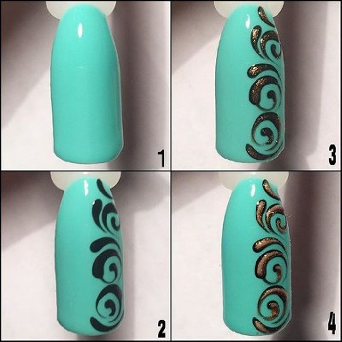 Золото на ногтях смотрится красиво и изыскано, особенно если узор выполнен на темно-синем, бордовом, мятном, красном или другом ярком цвете. Следует выбрать контрастный цвет, и накрасить им ногтевую пластину, придерживаясь пошаговой инструкции приведенной выше.
