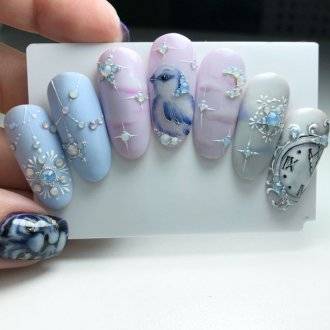 В качестве повседневного варианта можно выбрать любой вариант маникюра. Профессионалы в сфере нейл-индустрии рекомендуют отдавать предпочтение неброским цветам в спокойной гамме. Лучше всего украшать такой объемной лепниной только несколько ноготков. Как правило, это те, которые находятся на безымянном и большом пальцах.