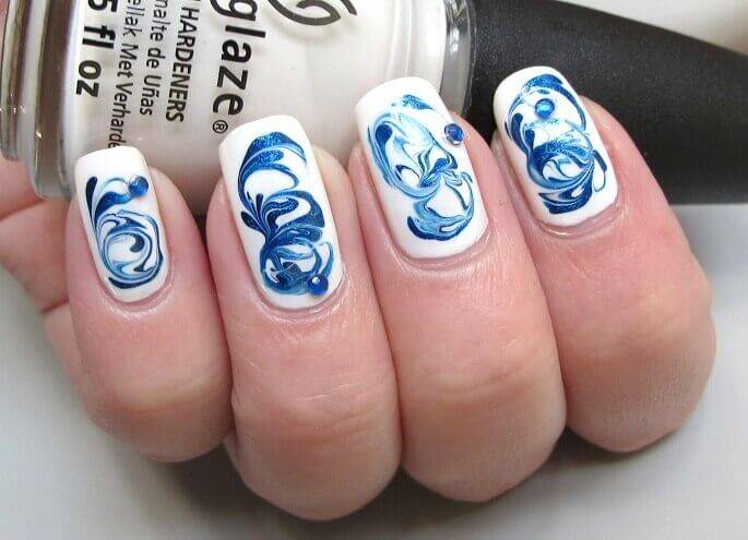 - Перенести каплю на ноготь и плавными неспешными движениями нарисовать узор. Для объемных узоров, линии следует удваивать, а пространство между ними оставлять незаполненным.
