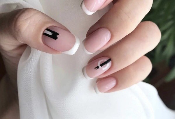 А можно с помощью френча и мазков сделать более элегантный образ. Например, если к любому классическому френчу добавить вертикальные черные мазки на нескольких ногтях. Тут главное не переборщить с количеством мазков, лучше сделать по одному вертикальному мазку на двух-трех ноготках. Иначе, образ может получиться перегруженным.