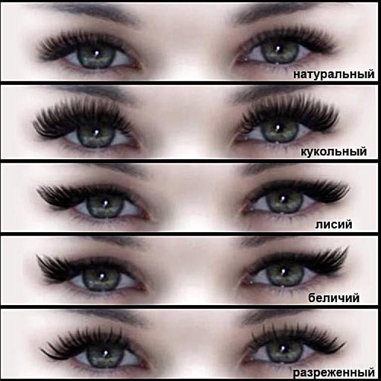 - «кошачий глаз» — ресницы приклеиваются в определенном порядке, от внутреннего уголка глаза до середины века крепятся волоски средней длины, а от середины века к внешнему уголку прикрепляются длинные ресницы;