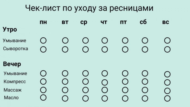Чтобы выработать привычку правильно ухаживать за ресницами скачайте чек-лист и каждый день ставьте отметку после процедуры. Он вам поможет ничего не забыть, а через несколько недель вы будете выполнять всё на автомате.