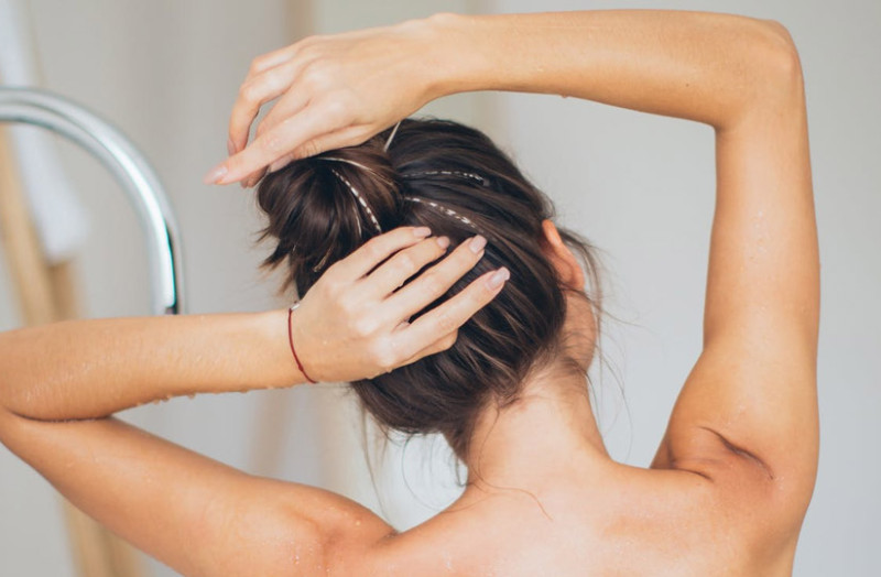 Вместо того, чтобы смочить волосы мощной струей воды и немедленно приступить к мытью, нужно позволить волосам хорошо намокнуть под средней или слабой струей воды, не помогая руками. Процесс должен протекать естественным путем.