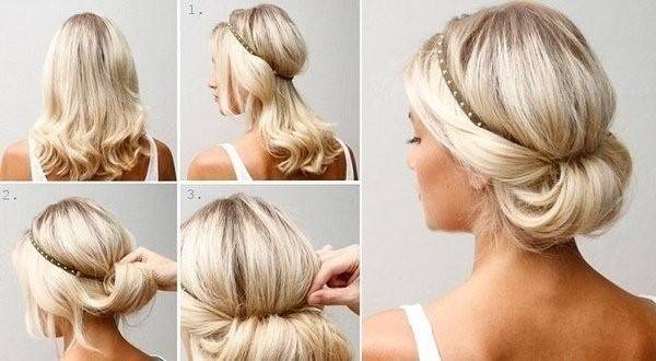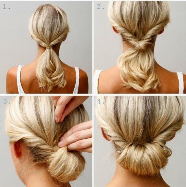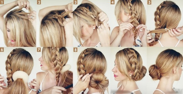 Сделать укладку на средние волосы не составит вам труда! Повседневный вариант – слегка небрежный пучок. Прическа такого типа омолаживает свою обладательницу. Сперва нужно промыть шевелюру, затем – немножко просушить и нанести термозащитный состав. Пряди следует просушить, наклонить голову и сделать пучок.
