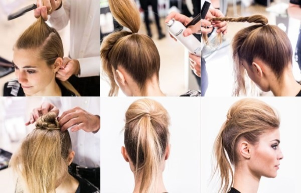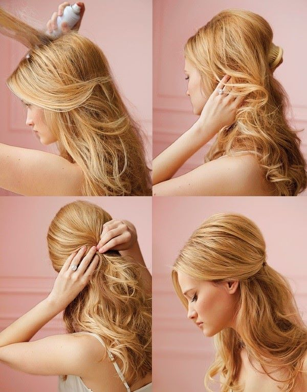 - Приподнять волосы на макушке, начесать, сбрызнуть лаком и уложить пышной копной.