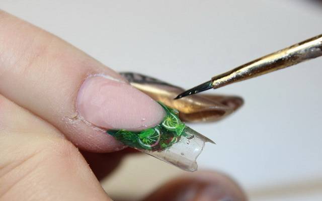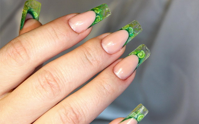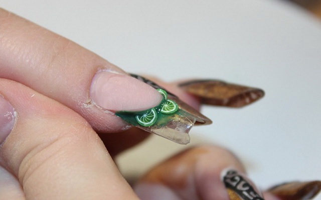 Также можно создать 3D эффект, добавив кусочки фимо цитрусовых на ногти. Это придаст дизайну объем и оригинальность.