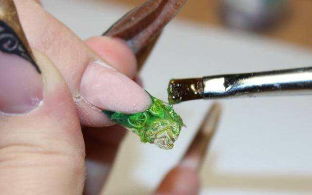 Украшение фимо-дизайна различными узорами является новинкой нейл-арта. Оно направлено на создание общей картины с помощью фигурок и дорисовок. К примеру, это может быть фимо-фигурка распустившегося бутона розы, к которой дорисован стебель с шипами и листочки.