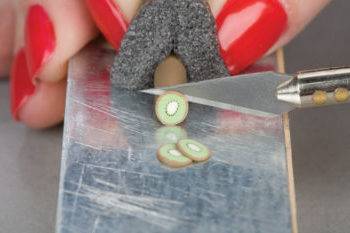 Самый простой способ нарезать фимо – это использовать нагретый нож. В местах продажи маникюрных принадлежностей иногда можно встретить и наборы для нарезки фимо, в которые входит тонкий нож, блок выполняющий функцию разделочной доски, специальный держатель, который помогает удерживать стик в устойчивом положении пока вы его режете, и небольшой контейнер, чтобы хранить уже нарезанные кусочки. Каждый стик даст вам около 50 кусочков фимо.
