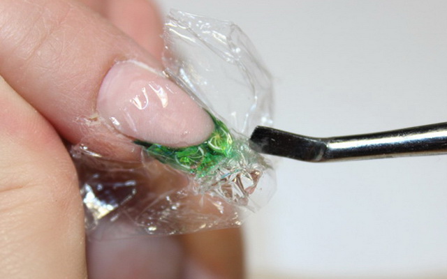 - Подготовить ноготь. Для этого потребуется удалить кутикулу и сделать полировку поверхности баффом для надежного сцепления с пленочным покрытием, а затем обезжирить.