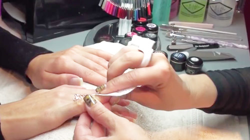 - Мастер обезжиривает ноготки, а затем лишь слегка отшлифует его пилочкой, это необходимо для более лучшего сцепления геля с пластиной.