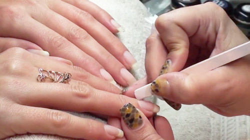- После наращивания всех ногтей подпиливаем их, придавая нужную форму, полируем пилкой.