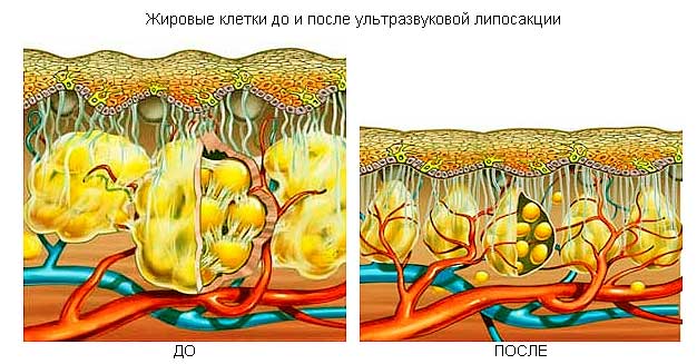 Множество подобных «микровзрывов» повреждает мембраны клеток-адипоцитов и высвобождает из жировых клеток жир в форме триглицеридов. При этом около 95% высвободившихся продуктов распада выводится посредством лимфатической системы, а 5% попадает в кровь, где преобразуется в глюкозу. При этом иные клетки, подобные мышечным фибриллам , клеткам эпидермиса и сосудов, не повреждаются ввиду их высокой прочности и эластичности.