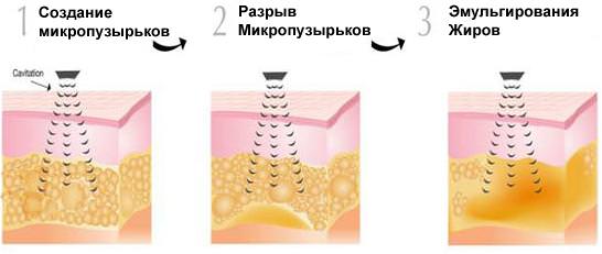 Оптимальными параметрами для воздействия на жировые ткани признаются значения частоты в 38-42 КГц, при которой формируется максимальное число полостей оптимальных размеров. Увеличиваясь, они вытесняют жир из клеток-адипоцитов . При этом наблюдается «схлопывание» микропузырьков, обеспечивающее гидродинамический толчок с высвобождением энергии.
