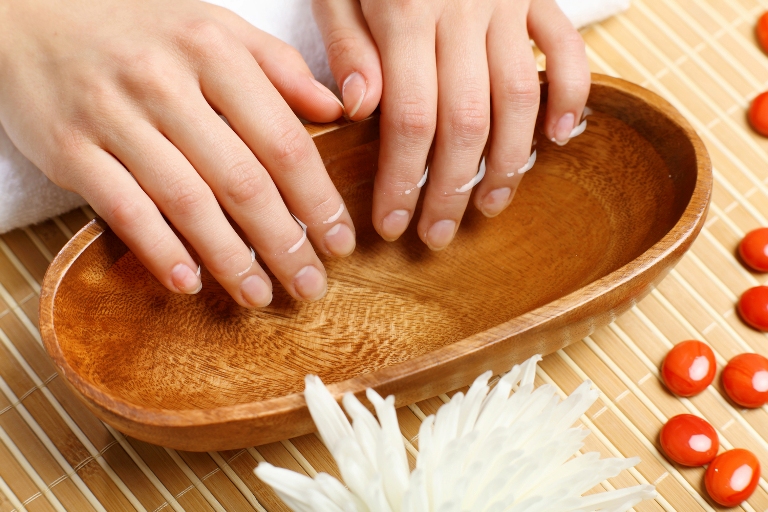 Сначала нужно удалить с ногтевой пластины лак. Затем руки на 10-15 минут опускают в ванночку с морской солью (она может не только размягчать, но еще и дезинфицировать).