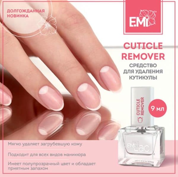 Ремувер. Специальное средство, в виде крема или геля, им можно обрабатывать кутикулу. Его наносят на кожу вокруг ногтя. Он отшелушивает мертвые клетки эпидермиса, которые после удаляют;