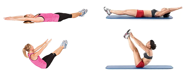 - Книжка – лягте на пол, ноги и руки прямые, руки лежат на полу над головой. Одновременно поднимите ноги и корпус тела так, чтобы коснуться пальцами носков ног;