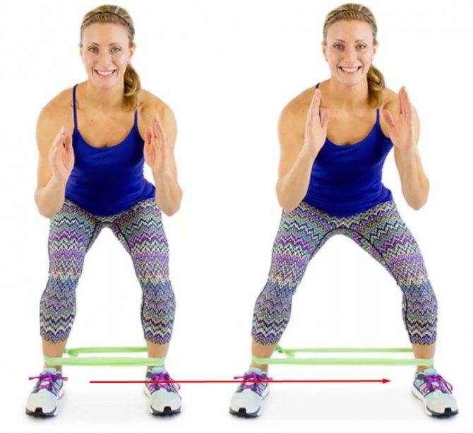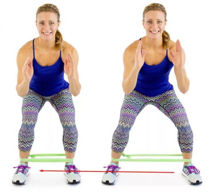 Можно выполнить ходьбу вбок. Это позволит прокачать не только ягодичные, но и бедренные мышцы. Наденьте инвентарь на уровне лодыжки, и расставьте их на уровне плеч. Следите за тем, чтобы резинка не провисала. Немного согните колени, и наклоните корпус. Руки соедините на уровне груди, и напрягите пресс. Не забывайте соблюдать равновесие. Сделайте по 3 шага влево, и вернитесь в исходное положение.