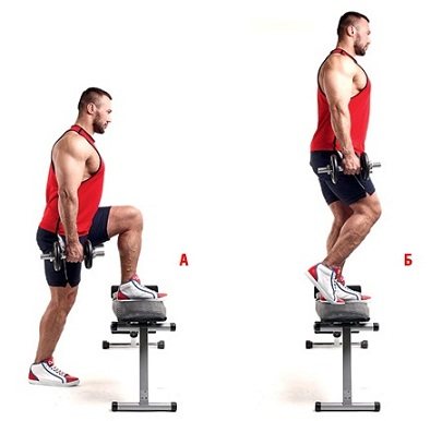 Упражнение делается с гантелями или штангой, следите за тем, чтобы высота опоры, на которую становитесь, была такой, чтобы колено было немного выше бедра.