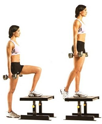• Зашагивание с двумя ногами – после того как вы встали на опору одной ногой, вы к ней приставляете другою. В этом случае расход сил и утомляемость меньше, так как ставя вторую ногу, вы убираете часть рабочего веса с первой ноги и ягодицы, гантели конечно еж здесь можно взять поболее.