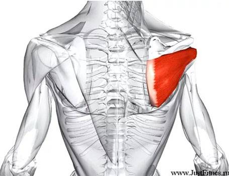 Широчайшие мышцы спины, похожие на 2 треугольника, проходящие от плечевой кости до крестца и подвздошной кости![]() | Подостная мышца, лежащая на лопатке![]() |