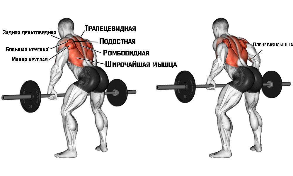 Тяга гантели в наклоне – позволяет тренировать широчайшую мышцу спины с максимальной амплитудой движения.