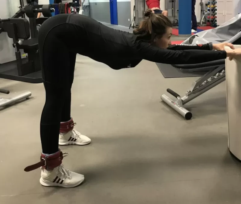 - Сядьте на табурет и закрепите ваши стопы. Старайтесь держать осанку максимально ровной, опуская при этом туловище назад;