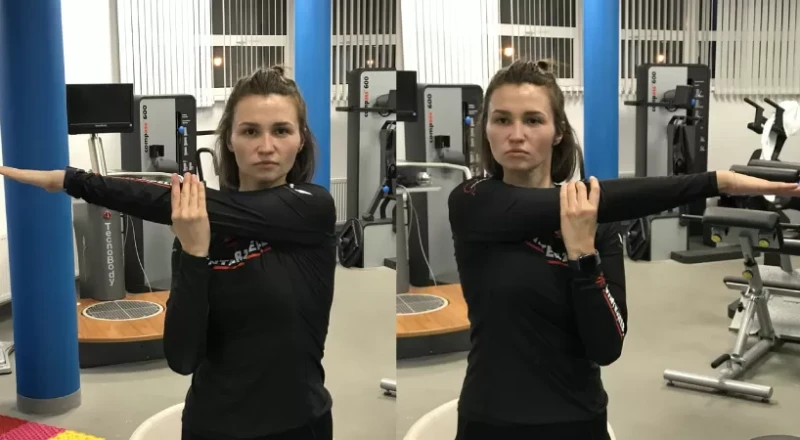 Выполняется стоя, ноги на ширине плеч, плечо и тело должны образовывать угол в 90 градусов. Затем максимально притягиваем руку к себе, помогая свободной рукой, держась за локоть. Делаем 5-7 повторов в каждую сторону.