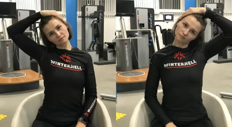 Сидя на стуле, выпрямив спину, медленно растягиваем мышцы шеи, наклоняя голову вправо и влево. Помогаем рукой со стороны наклона. Повторяем 5-7 раз в каждую сторону.