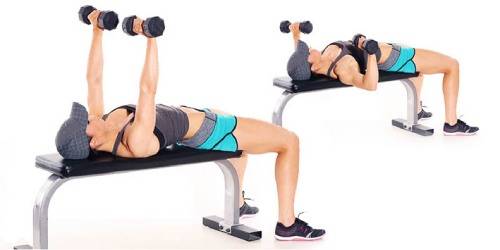 - Лягте на коврик, колени согните, ступни прижмите к полу. Держите в руках прямо над грудью пару легких гантелей. Ваши ладони должны быть развернуты друг к другу. А руки должны быть слегка согнуты (представьте, что вы обнимаете толстое дерево).