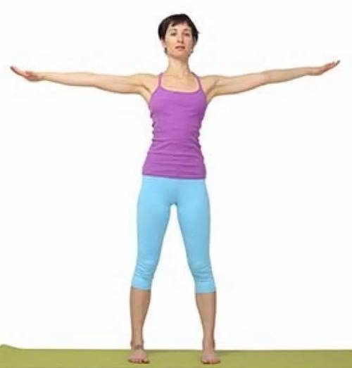 3. Разворачиваем ладони в стороны и, одновременно совершая выдох через сжатые губы, опускаем прямые руки в исходное положение.