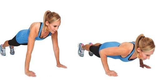 - Опустив плечи и втянув живот, опустите руки вниз, пока они не коснутся пола. Сожмите мышцы груди в нижней точке.