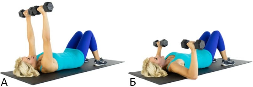 - Лягте на коврик, колени согните, ступни прижмите к полу. Держите в руках прямо над грудью пару легких гантелей. Ваши ладони должны быть развернуты друг к другу. А руки должны быть слегка согнуты (представьте, что вы обнимаете толстое дерево).